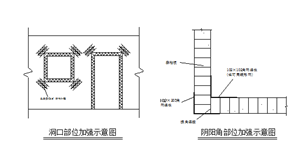 ⑦并在所有陰陽角、門窗洞口板縫處要設加強網,陰陽角處用角網,門窗洞口用不小于600MM的平網呈45度角放置補強,用扎絲將其綁扎牢固,見下圖: